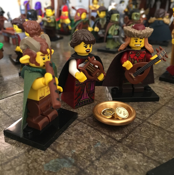 Nothing like a little street performance when getting your shopping done. Today, David Pruitt brings us a couple of custom minifigures making merry at the medieval marketplace. And it looks like this trio are crowd pleasers judging by the gold pieces in their dish! The lady in the middle plays the Lyre and it looks like she does a bit of singing too while the man with the flowing locks keeps the rhythm by strumming his Lute. Rock on!