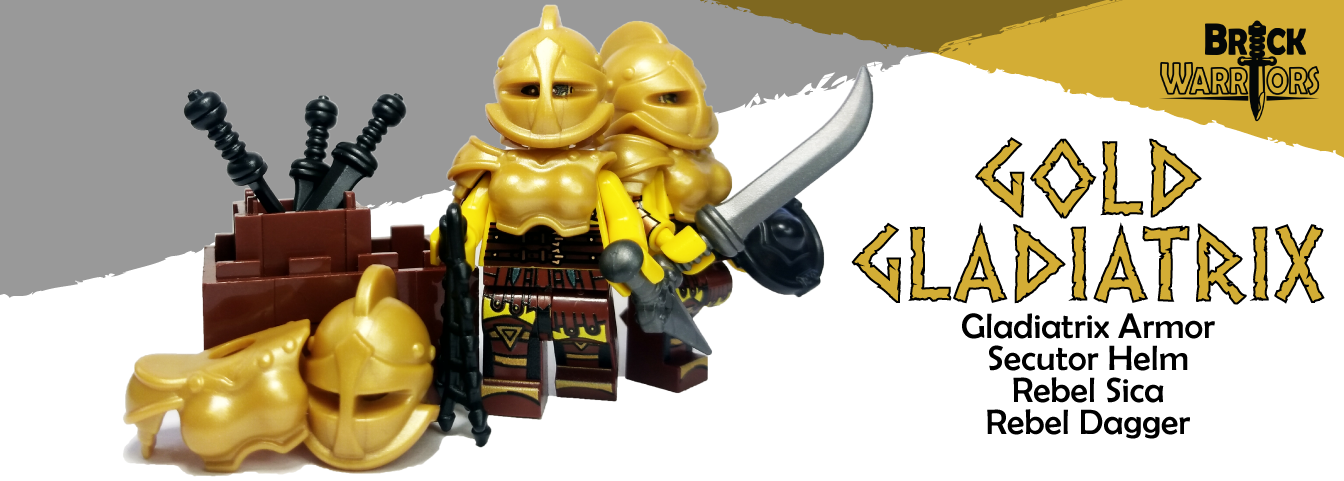 If you enjoyed BrickWarriors' March release of our brand new Gladiatrix and Secutor accessories, you'll be thrilled to stock up on them in a brand new color! Outfit your warrior in gold armor and weapons, and take her girl power to a new level. Check out the Secutor Helmet, Gladiatrix Armor, Rebel Dagger, and Rebel Sica, all now available at BrickWarriors!