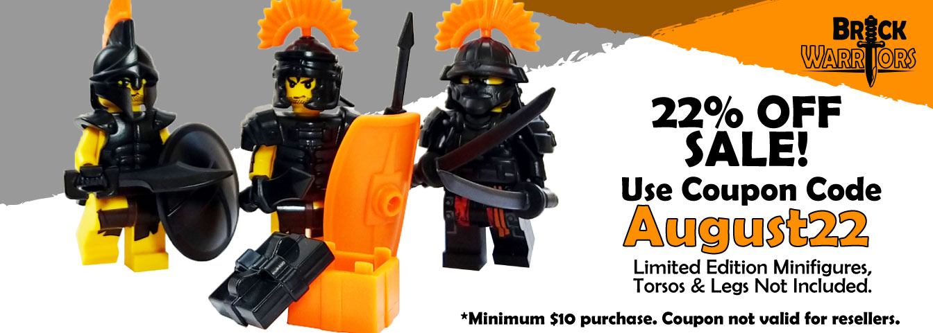 Got the back-to-school or end-of-summer blues? We have just the way to turn that frown upside down- by enjoying 22% off your purchase at www.BrickWarriors.com. From now until until Midnight (EST) on Sunday, take 22% off every gun, weapon, helmet, sword, and accessory. Just enter Coupon Code August22 at checkout. Enjoy!